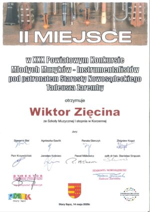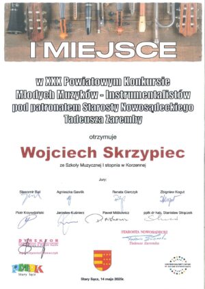 Miło jest nam poinformować, że nasi uczniowie fenomenalnie prezentują się na konkursach muzycznych. Uczniowie Wojciech i Wiktor z klasy akordeonu zdobyli kolejno 1 i 2 miejsce w XXX Powiatowym Konkursie Młodych Muzyków Instrumentalistów w Starym Sączu. Serdecznie gratulujemy uczniom oraz nauczycielowi Panu Aleksandrowski Cetnarowskiemu. Brawo