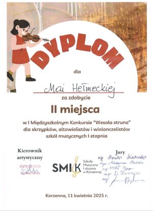 Gratulujemy Mai Hełmeckiej skrzypaczki z klasy skrzypiec Pani Moniki Małgorzaty Miechurskiej za zdobycie II miejsca w I Międzyszkolnym Konkursie Wesoła Struna dla skrzypków altowiolistów i wiolonczelistów szkół muzycznych I stopnia. ![]()