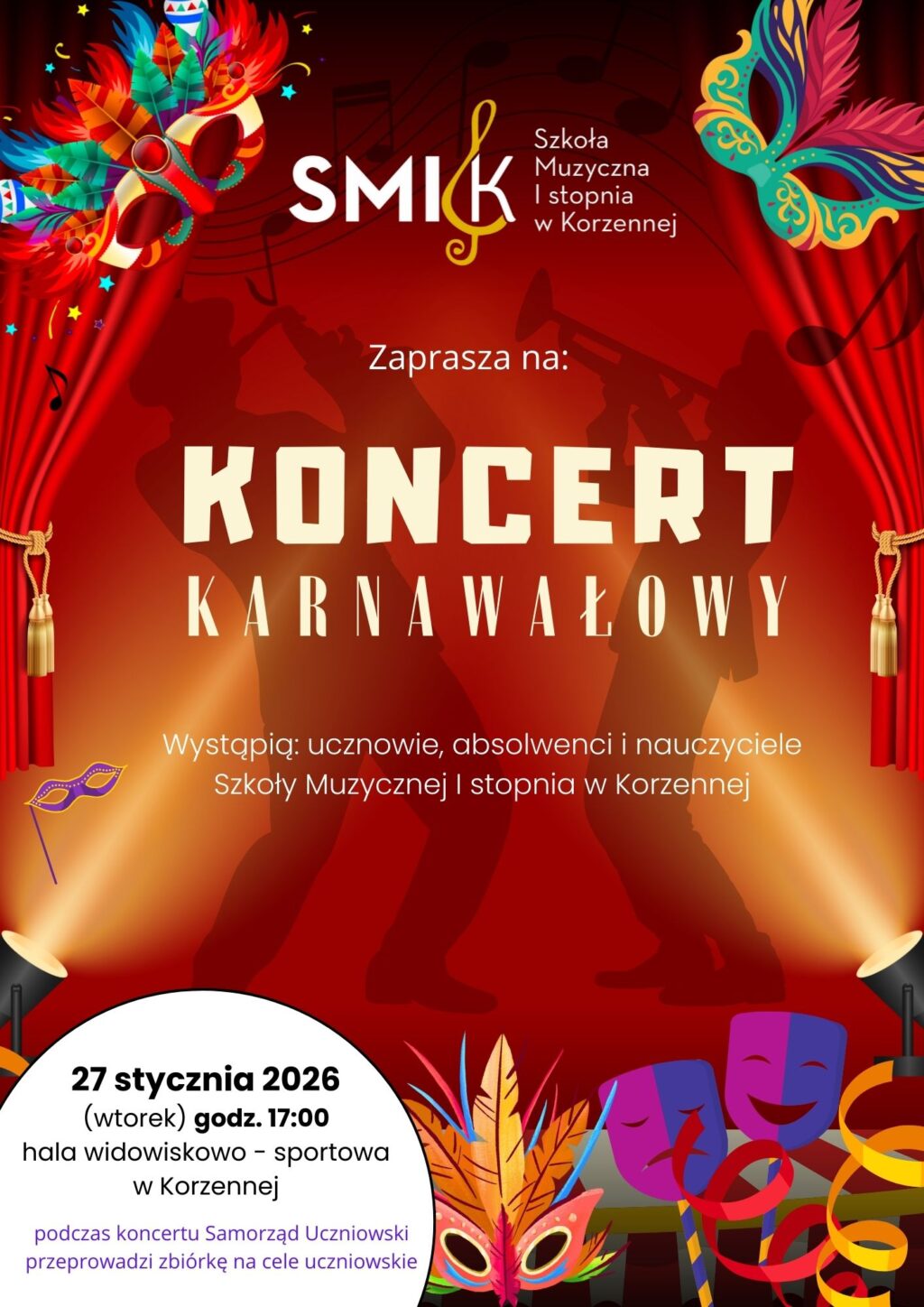 27 stycznia 2026 r. hala widowiskowo-sportowa w Korzennej wypełniła się muzyką, radością i karnawałową atmosferą. Podczas Koncertu Karnawałowego Szkoły Muzycznej I stopnia w Korzennej na scenie zaprezentowali się uczniowie, absolwenci oraz nauczyciele szkoły, dostarczając publiczności wielu artystycznych wzruszeń i niezapomnianych emocji 🎺🎹✨