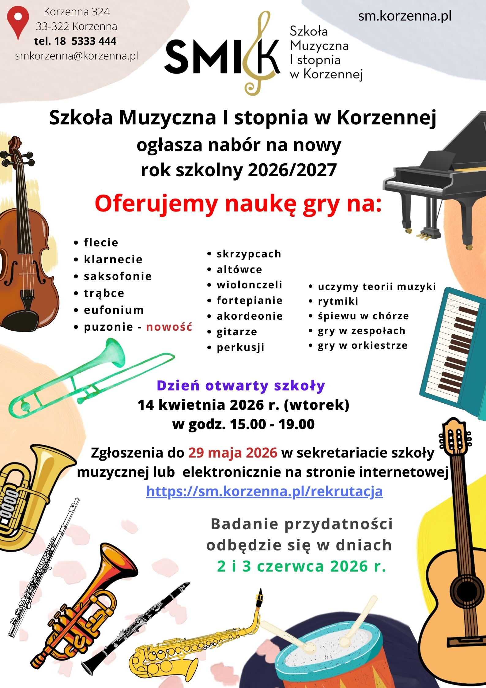 Z radością informujemy, że rozpoczynamy nabór do Szkoła Muzyczna I stopnia w Korzennej na rok szkolny 2026/2027.